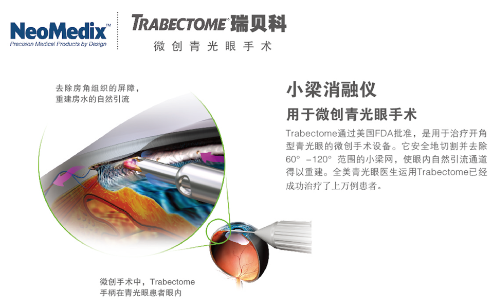 小梁消融仪Trabectome是美国NeoMedix公司隆重推出的一种青光眼微创手术设备,是用于治疗开角型青光眼的内路小梁切除术Ab Internal Trabeculectomy,欧美国家已把该术式作为治疗开角型青光眼的优选治疗手术。